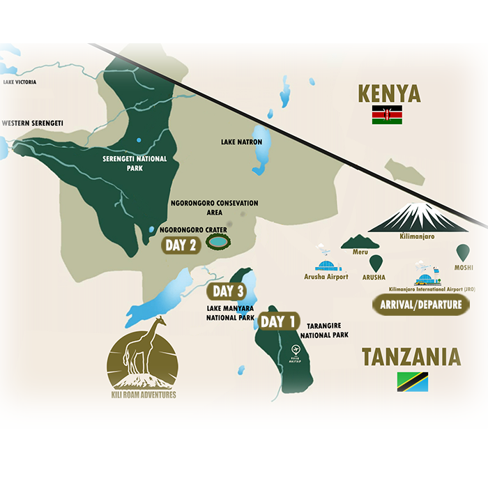 Enjoy a picnic lunch in one of the park’s designated spots, taking in the tranquil scenery and sounds of nature. In the afternoon, you’ll begin your journey back to Arusha, where you’ll arrive in the early evening, marking the end of your memorable 3-day safari adventure with Kili Roam Adventures.